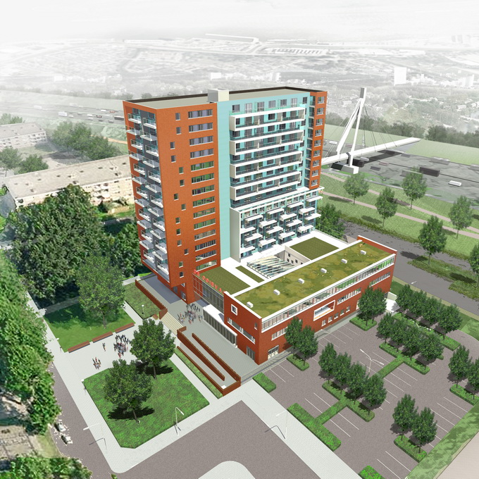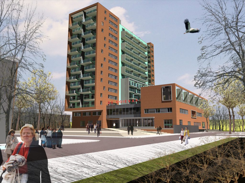 Het meerzijdige servicecentrum van Woonbron is gelegen op een half verdiepte parkeerplaats voor 100 auto’s, het huisvest zorg- en welzijnsfuncties voor Laurens, Gemiva-SVG Groep, Middin en Pameijer, maar ook het kantoor van Woonbron, een budgetrestaurant en een apotheek. Te midden van deze functies is een atrium ontworpen dat dient als centraal plein, een ontmoetingsruimte waar buurtactiviteiten kunnen plaats vinden en de verschillende functies transparant en zichtbaar mee verbonden zijn. Bovenop deze functies vormen de woningen een landmark van het gebouw. Er bevinden zich 93 woningen verdeeld over 14 woonlagen.