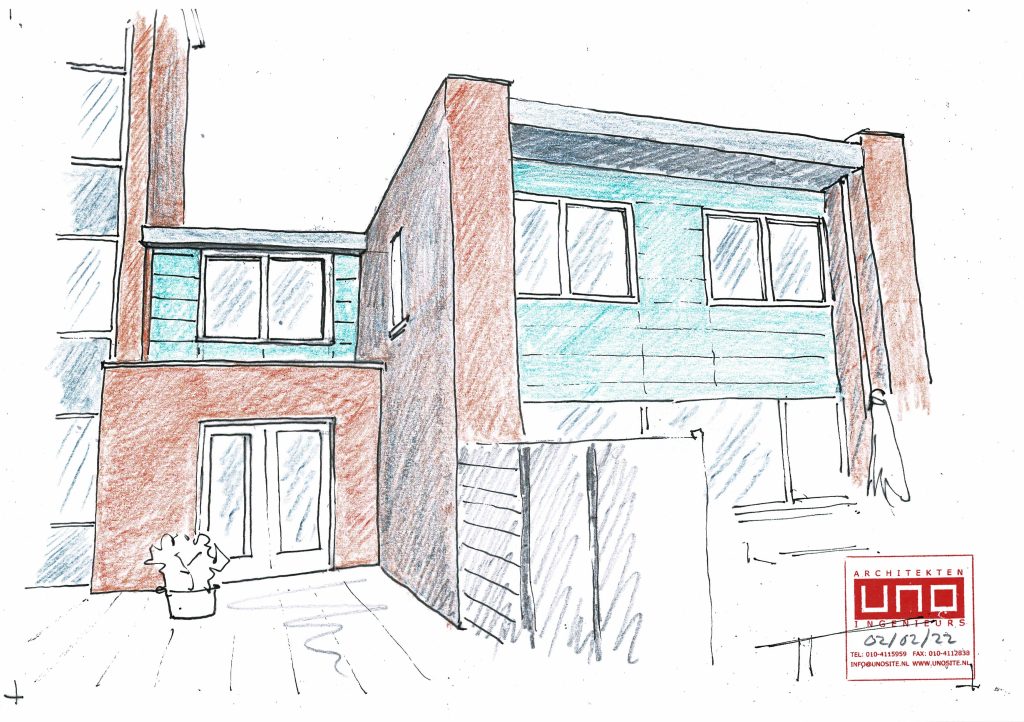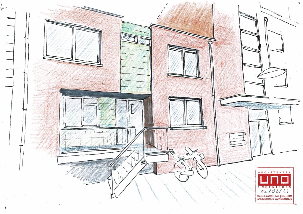 Een van de woningen aan de Salawitihof in Utrecht heeft een eenlaagse aanbouw naast het woonhuis. De aanbouw krijgt een nieuwe verdieping die vanuit de 1e verdieping wordt ontsloten. In de aanbouw komt een douche, slaapkamer met grote inloop kast.