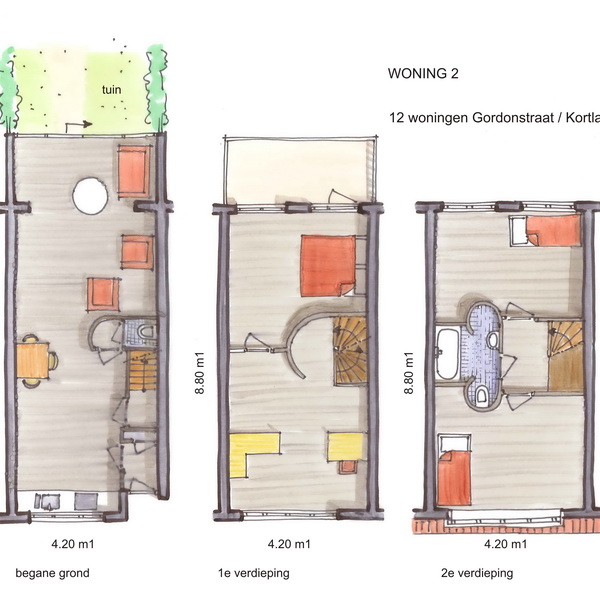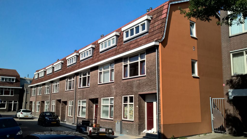 Deze woningen waren vijf jaar geleden voor sloop bestemd. Samen met de gemeente Schiedam hebben we de bouwkundige toestand onderzocht en besloten hier een duurzaam project te realiseren. 18 woningen worden samengevoegd tot 12 kluswoningen met een oppervlak van ca 115 m2 en eigen tuin rond een gemeenschappelijke binnentuin. De woningen krijgen een nieuwe paalfundering, geïsoleerde gevel en dak met nieuwe kozijnen en eigen tuin. De bodemverontreiniging onder de woningen wordt door de gemeente geheel gesaneerd. De kopers moeten het interieur zelf ontwerpen en mag geheel zelf naar eigen wens worden ingericht of met professionele hulp worden afgebouwd. De inschrijving voor deelneming is gestart in juni 2014, na vier maanden waren alle woningen verkocht.