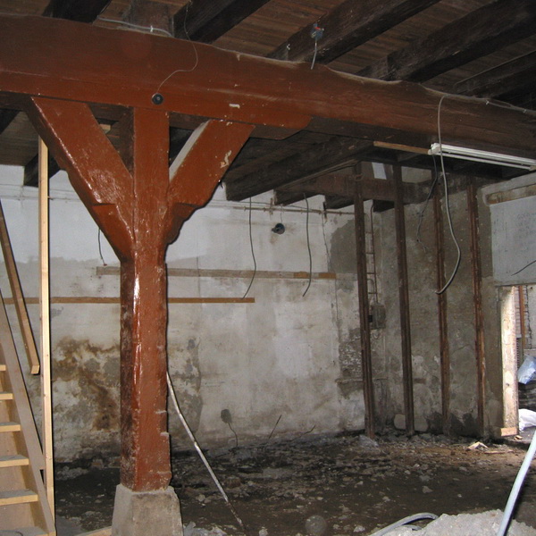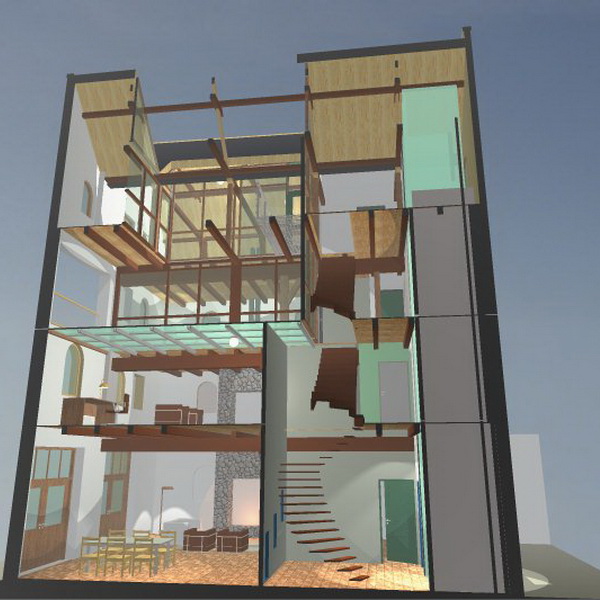 Het funderingsprobleem is gestabiliseerd met een constructie die naar de paalfundering bij de nieuwe lift leidt. Om voldoende daglicht in het pakhuis te krijgen is een lichthof in het dak gemaakt met een beloopbare glazenvloer op de 1e verdieping. Daarmee werd ook het vereiste woonoppervlak gereduceerd. De begane grond is een grote living met uitloop naar de binnenplaats geworden, de eerste verdieping een ruime bibliotheek. Op de twee verdiepingen erboven zijn de slaap en badkamers gerealiseerd.