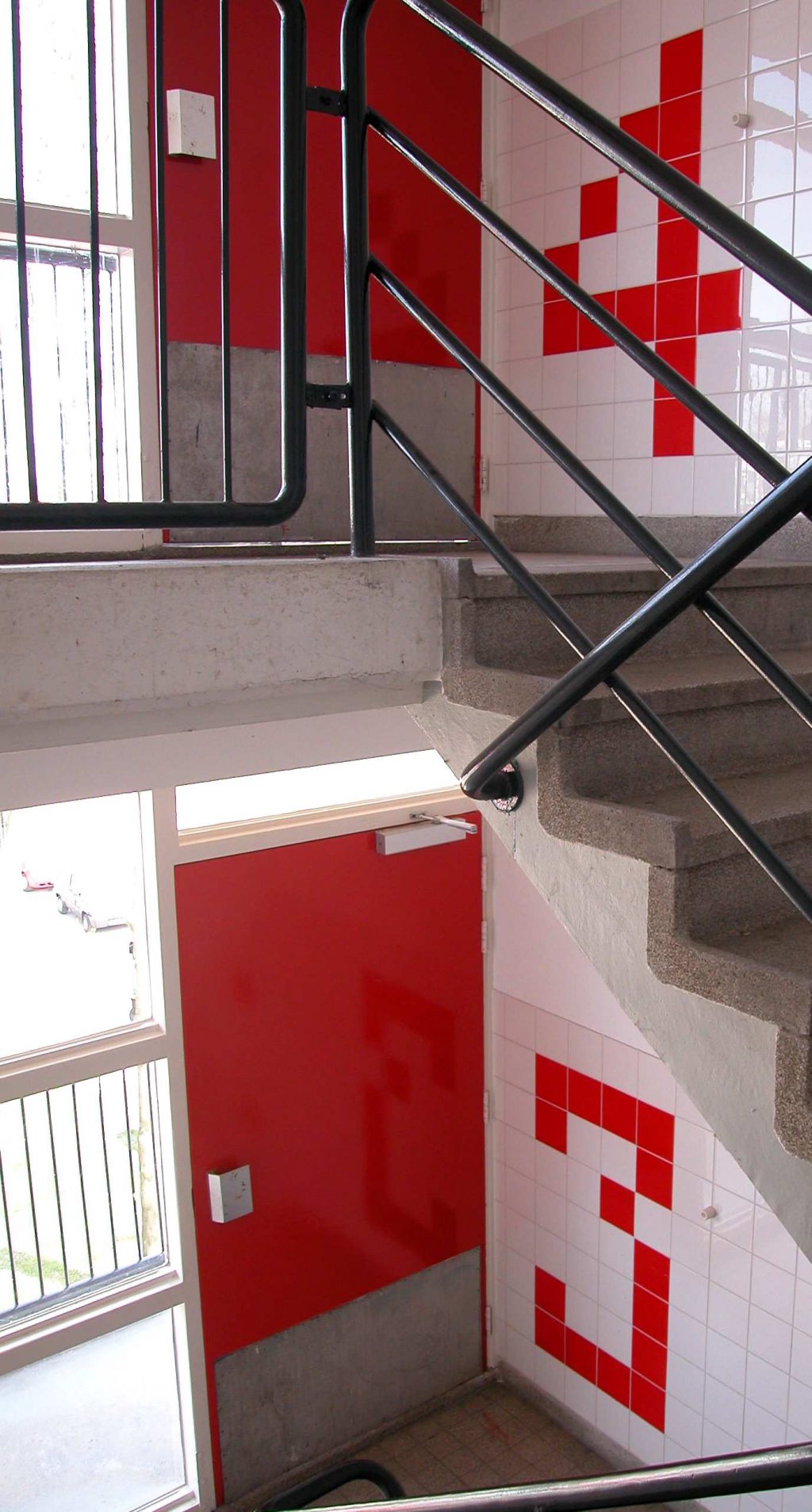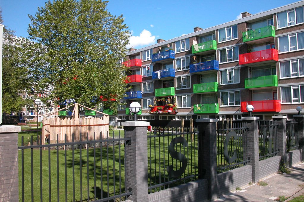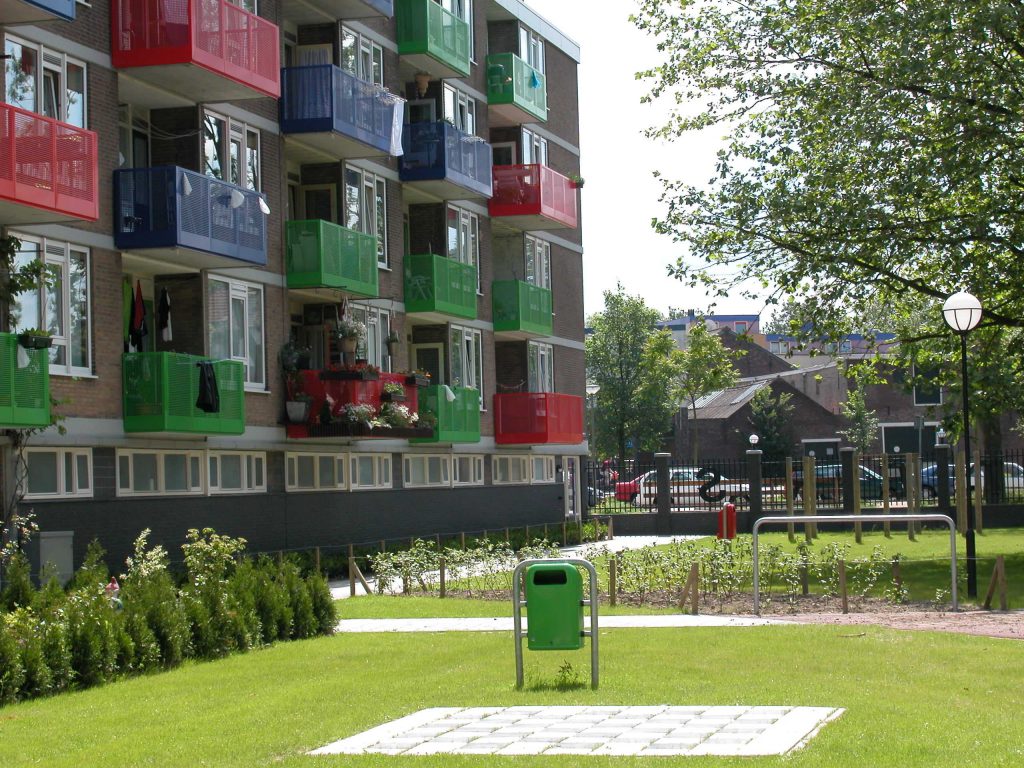 Het stempel van drie galerij flats en een portieketage flat dateert uit de tweede uitbreidingsfase van de wijk Nieuwland in de jaren zestig. Het verval trad in de jaren negentig in. Met name de overlast van “hangjongeren” was een groot probleem. Besloten werd grootonderhoud van de woningen met een facelift te realiseren: nieuwe entrees, balkons, sanitair en installaties. Om het woonklimaat voor de bewoners te vergroten heeft UNO voorgesteld de binnentuin af te sluiten en alleen voor bewoners toegankelijk te maken. UNO heeft ook de binnentuin ontworpen, en heringericht met spannende speeltoestellen en afwisselend groen. De bewoners konden kiezen uit verschillende balkonafmetingen en kleuren. Het gevolg is een vrolijk spel van kleur en vorm.